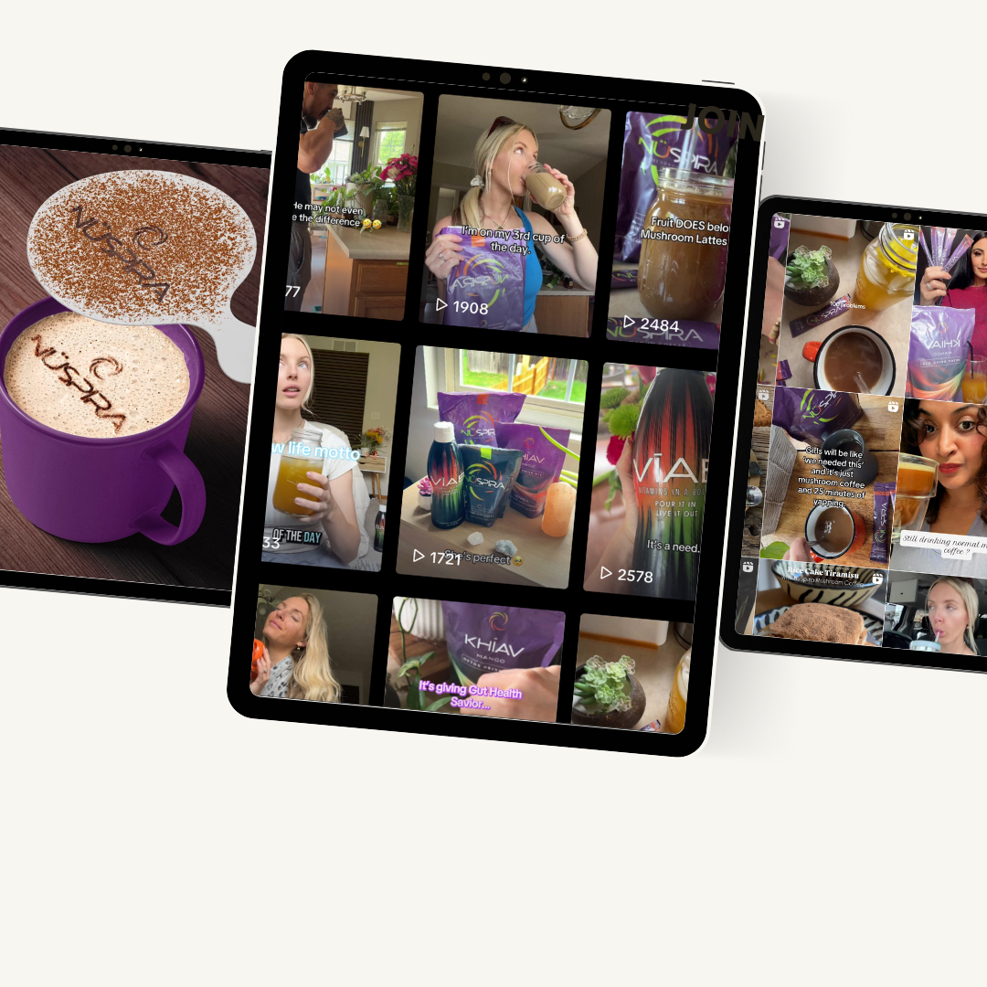 • Black & Latte Mushroom Coffees → Add one packet to 8 oz of hot water, stir or froth, and enjoy. Note that you can also mix packets in room temperature water to make iced coffee as well. • VIAB Liquid Multivitamin → Take the recommended daily serving directly or mix it into juice or smoothies. • KHĪAV Detox Drink → Add one packet to a 16 oz of bottle of water. Shake until dissolved.