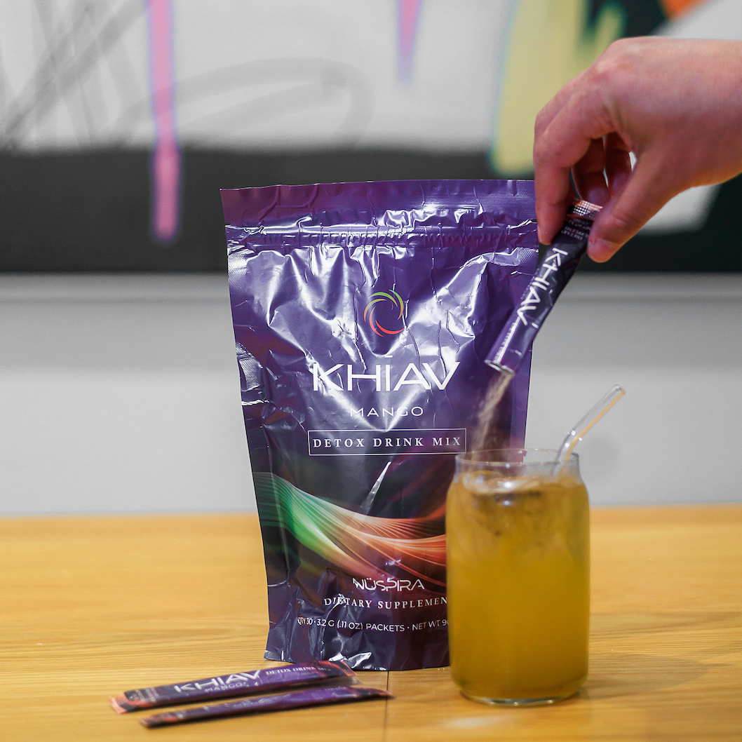 - Anytime Reset: Mix one KHĪAV Mango Detox stick with 8 oz water; stir to dissolve. Best once daily.