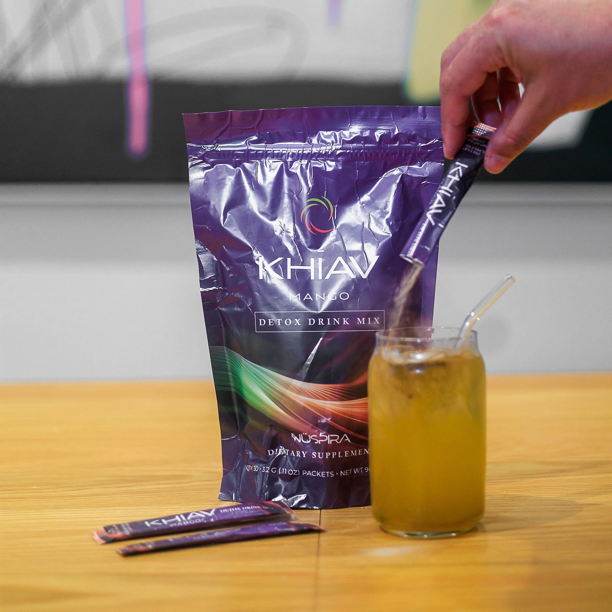 - Anytime Reset: Mix one KHĪAV Mango Detox stick with 8 oz water; stir to dissolve. Best once daily.