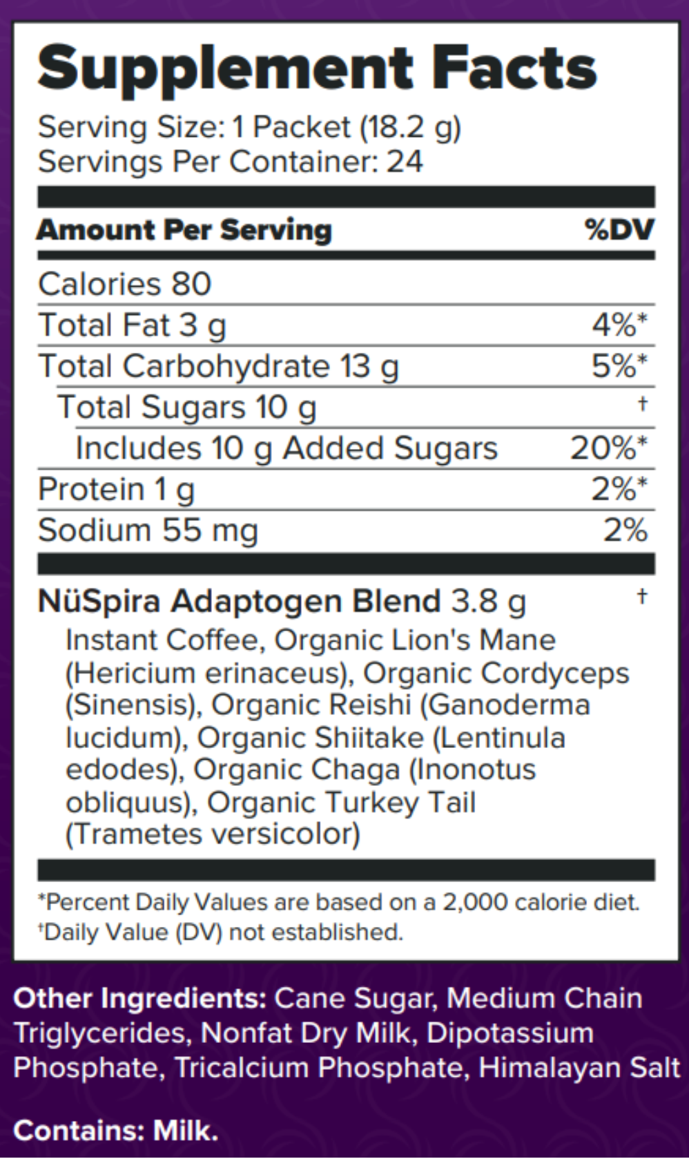 - Latte Mushroom Coffee (24 stick packs) — A creamy Arabica latte infused with a 6-mushroom blend (Lion’s Mane, Cordyceps, Reishi, Turkey Tail, Shiitake, Chaga) for a smooth lift and everyday wellness support.
